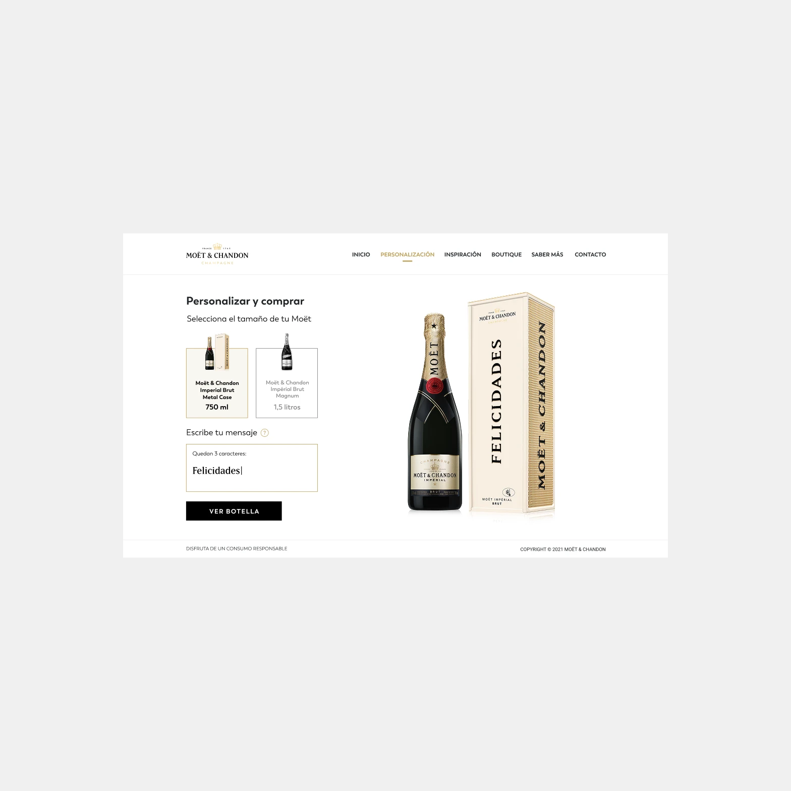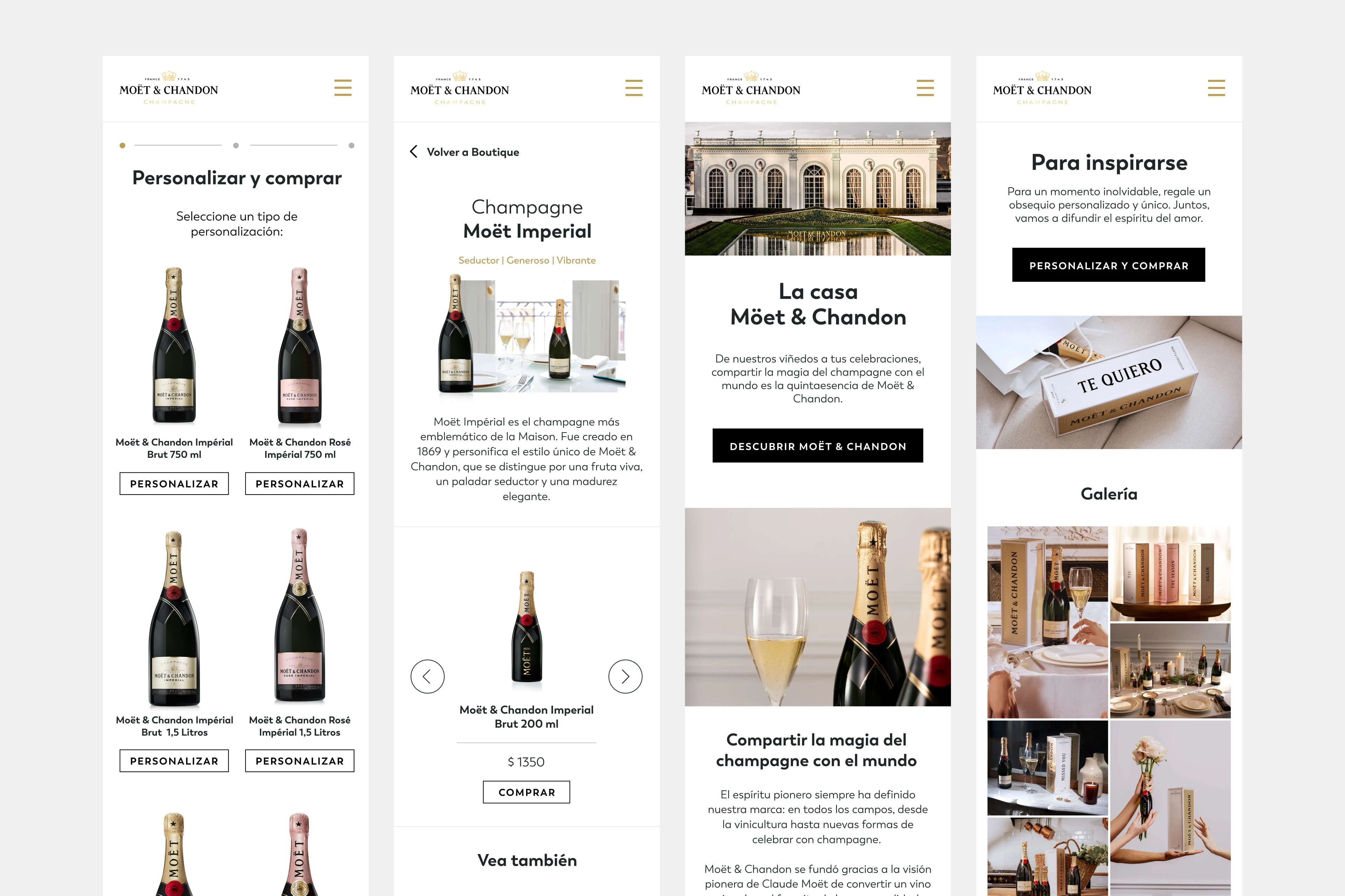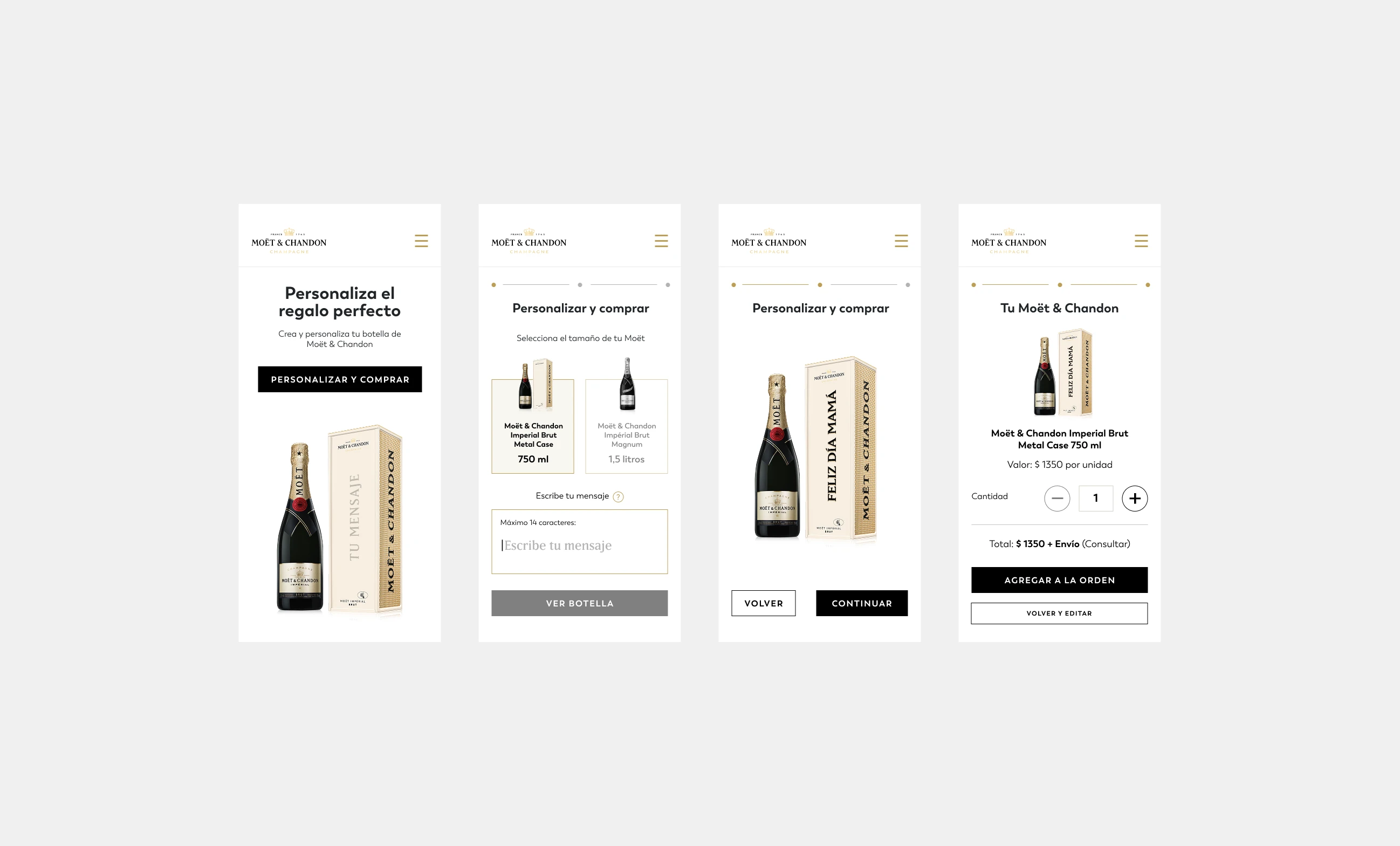 Moët Gift Shop is the online version of Moët & Chandon's official boutique and pop-up store experience, designed as a temporary luxury destination focused on gift personalization and exclusive labels. I was invited to design the platform for Brazil and Mexico, creating the experience for bottle and case personalization with custom typography and stickers, directing customers to partner e-commerce platforms in both countries.